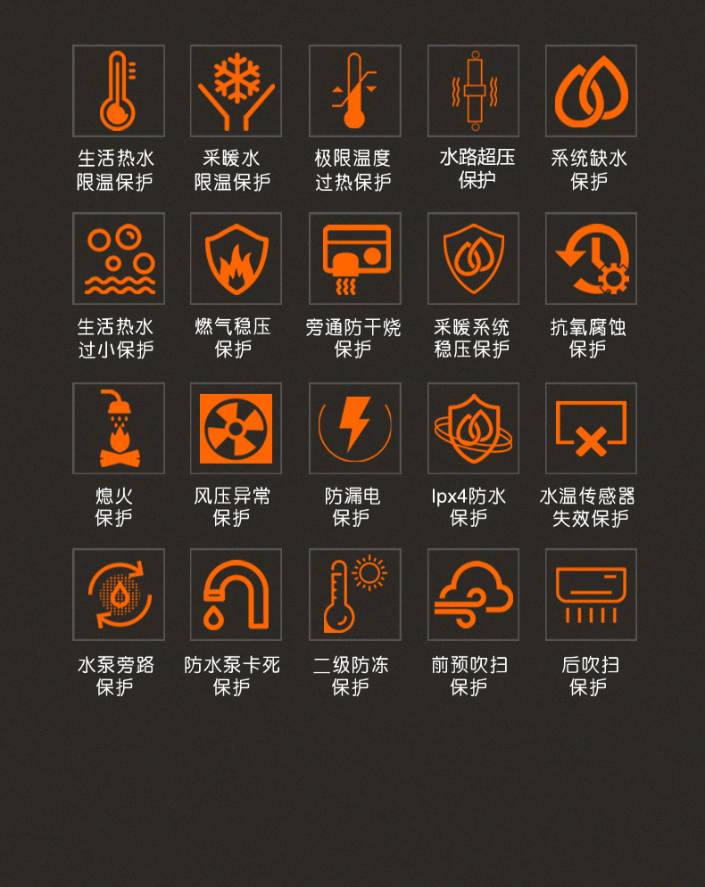 燃氣熱水器一般具備的保護功能有:防意外熄火、防沸騰、燃氣泄露保護等十余項,壁掛爐安全保護功能則更多,如菲思盾壁掛爐還涵蓋風壓保護、供暖系統(tǒng)過壓保護、安全泄壓、自動排氣、煙道堵塞保護等多重防護措施,遵從“安全采暖”宗旨,讓用戶能夠放心使用。