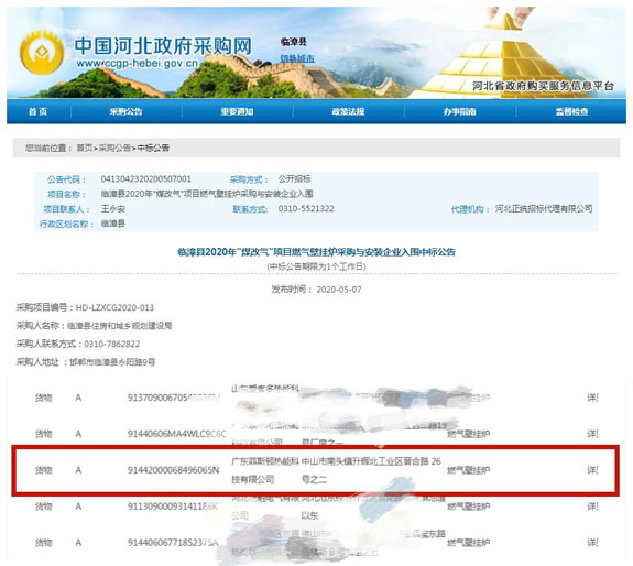 臨漳縣2020年“煤改氣”項目燃氣壁掛爐采購與安裝企業(yè)入圍中標公告