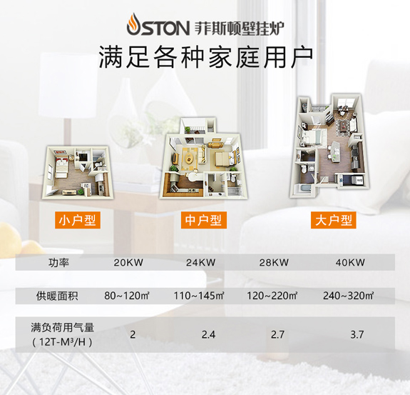 根據(jù)房屋的戶型不同,對壁掛爐的功率大小要求也不同。一般來說80-120平方米的戶型應(yīng)使用20KW或以下的壁掛爐,120-200平方米的戶型應(yīng)選用20KW-30KW的壁掛爐,而220平方米以上的戶型應(yīng)使用32KW及以上的壁掛爐。