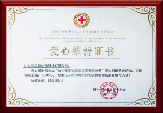受贈(zèng)方代表西寧市城中區(qū)疾病預(yù)防控制中心副主任表示感謝:“你們的關(guān)愛與支持,是我們戰(zhàn)勝疫情的強(qiáng)大后盾,讓我們感受到無比溫暖,為我們增添了無窮力量。同時(shí),我們也更覺責(zé)任重大、使命光榮。在此,西寧市全體抗疫戰(zhàn)士向社會(huì)各界愛心企業(yè)、團(tuán)體、人士表示衷心的感謝!”并為捐贈(zèng)企業(yè)廣東菲思頓熱能科技有限公司頒發(fā)了“愛心慈善證書”,以肯定菲思盾的愛心捐獻(xiàn)。